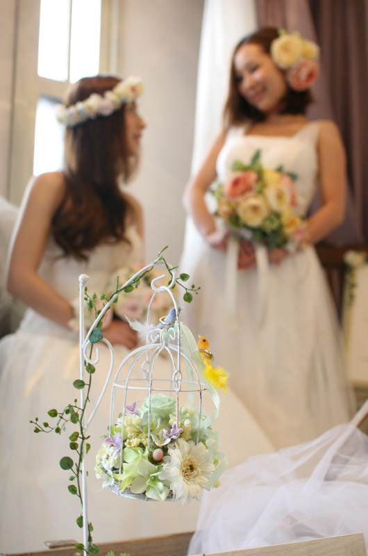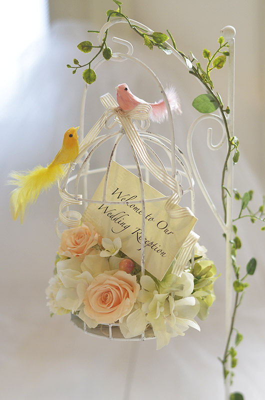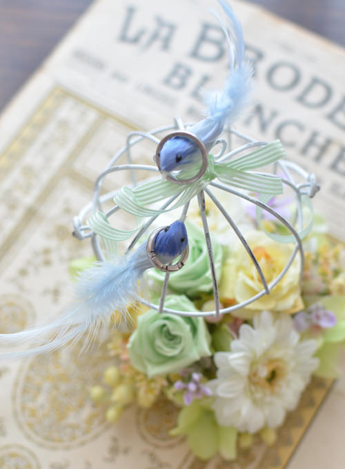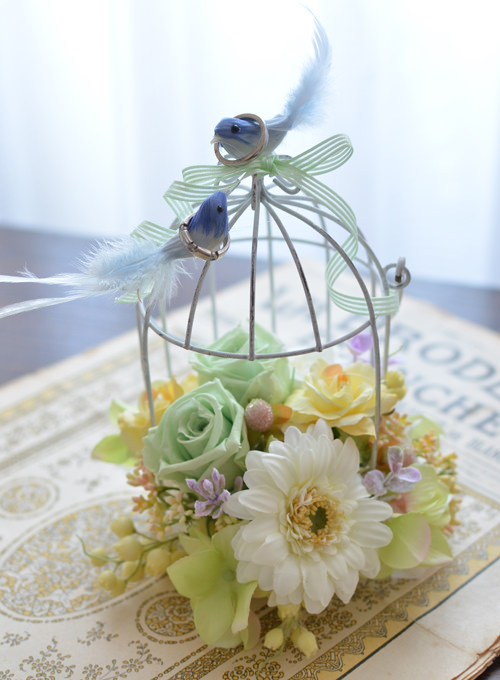 プリザーブドと造花でフラワーアレンジした鳥カゴのリングピロー
