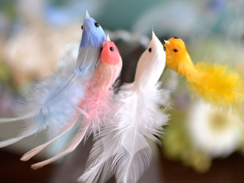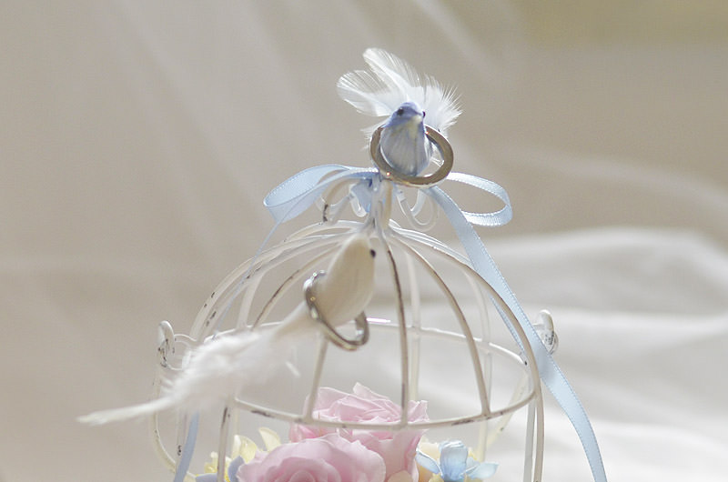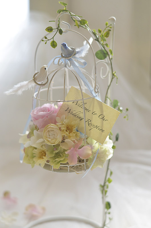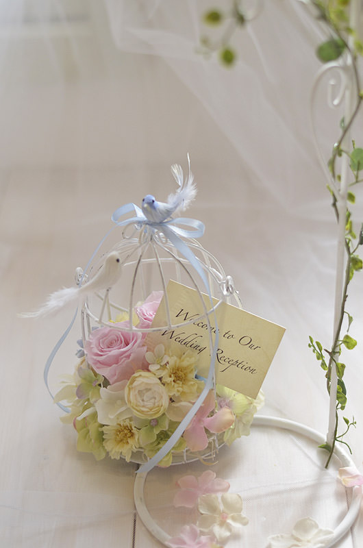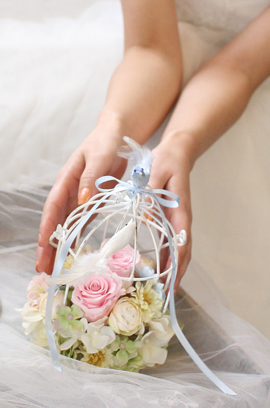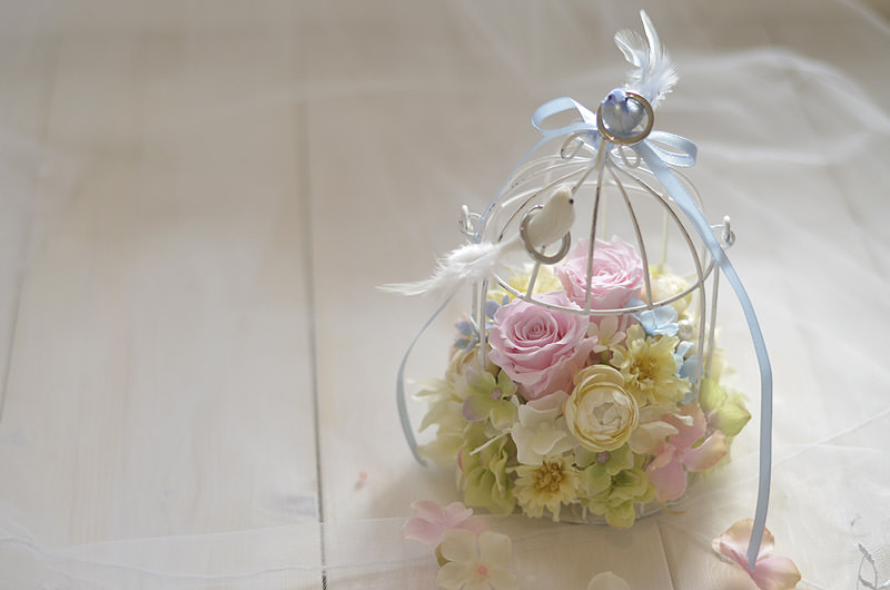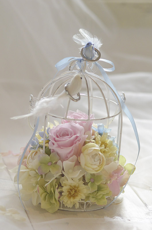 プリザーブドと造花でフラワーアレンジした鳥カゴのリングピロー