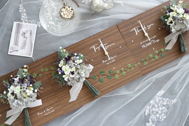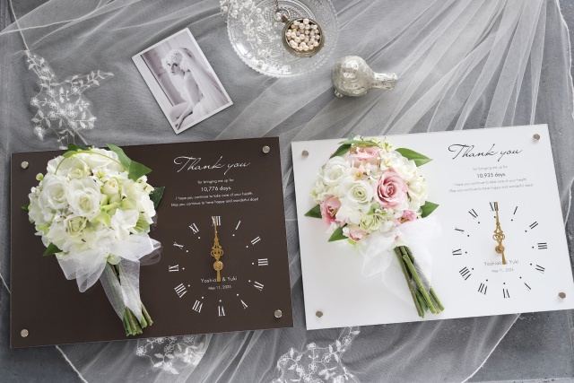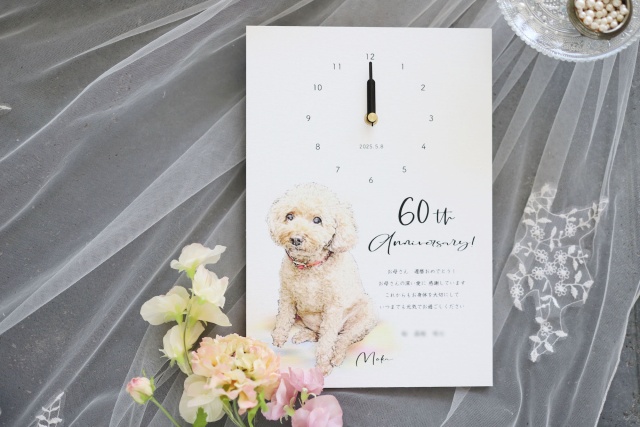 お届けアイテム Date . 2025.07.20 こんにちは、**Fino(フィーノ)**です 夏の真っ盛りの今日この頃。 9月挙式・秋のギフトシーズンに向けて、準備はいかがですか? こちらの画像はリースのお花を変更してお作りした メッセージリース時計です。 時計のお色は同じでもお花のカラーでイメージも変わりますね♪ お花のお色変更は同シリーズ(MOKKA)の時計であれば 無料で変更可能です。 ご注文時に備考欄にご希望の内容をご入力下さいませ。 (例)「ナチュラルバーチのピンクのリースに変更」 こちらは「家族と家族が繋がる時計」 ご両親贈呈品でもベストセラーの時計となっております。 左右がご両親贈呈用、真ん中がご新居用に♪ その他にも…♪ 結婚式の準備もいよいよ本格化するこれから 「両親へのプレゼント、そろそろ決めておきたい」 というお客様にオススメのアイテムを多数ご用意しています♪ ///////フィーノのココがオススメ!////// 【木製花時計】:お名前や記念日を刻める、お花と時計の華やかな贈り物 【育ててくれた日数入りギフト】:ご両親への感謝をかたちに 【繋がる時計】:家族のつながりを感じる、心温まるギフト 【ペットの似顔絵時計】:毎日がちょっと楽しくなる、うちの子イラスト時計♪ 【メッセージを入れられる】:普段伝えられない気持ちを伝える など、退職祝い・結婚祝い・還暦祝い・開店祝いなどにもご好評いただいている 「特別感」と「実用性」を兼ね備えたギフトが人気です! こちらは還暦祝いの贈り物としてお作りしたペットのイラスト時計♪ ご注文後にお客様から送られてくる可愛いペットのお写真と 仕上がった時計のペットのイラストにこちらまで癒されるアイテムです! 〜お急ぎのお客様へ〜 お急ぎには可能な限り対応致しております(額縁を使用した商品を除く) ご希望の納期など、ご心配な場合はお気軽にお問い合わせ下さいませ。 〜フィーノよりお届けした皆様に沢山の幸せが降り注ぎますように!〜 一覧へ戻る