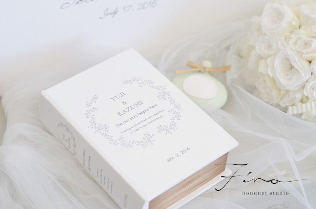 二人のお名前と挙式日が印字された、 世界にひとつだけのブックボックス型のリングピロー。 表紙と背表紙の名前や挙式日の他に、 ブックボックスをあけると、実際の洋書のようにインデックスが… 本のタイトルは、 「 The our story begins here… 」 「 二人の物語はここから始まる… 」 そして、ページを捲ると結婚誓約書と お二人のリングが並ぶ、ロマンティックなリングピローです♪ 名前入りのウェディングアイテムは、 挙式後も宝物として、飾っていただけます! 世界にひとつだけのアイテムで、二人の物語を綴ってください。 ブックの表紙と背表紙に、 お二人のお名前と挙式日を印字します。 カラーは5色の中からお選びいただけます。 左から・キャメル/茶 ・ネイビー/紺 ・ホワイト/白 ・グリーン/緑 ・ライトグレー/灰色 ホワイト以外は、ビンテージ加工 (擦れや染み)が施してあります。 ブックボックスの材質は、ポリエステル織布のため、 手触りがよく優しさとぬくもりが感じられます♪ お花は3色の中からお選びいただけます。 左から・ホワイト ・ピンク ・オレンジ オプションのフラワーペンもおススメです♪ 1,600円(ただ今、ご購入いただけません) ホワイト ネイビー お二人のお名前、挙式日の入ったオリジナルアイテム。 梱包サイズ(小) 送料 660円〜 > 地域によって異なります 2万円以上のご注文で送料無料!(北海道・沖縄は送料半額) 価 格 Sold Out.- 同じシリーズの商品 Recommend item 木製ブック型の結婚誓約書とウェディングツリー 結婚誓約書とウェディングツリーを木製ブックにまとめたお洒落なアイテム。 木製ブック/結婚誓約書&ウェディングツリー Sold.- 木製ブック型の結婚証明書とウェディングツリー 結婚証明書とウェディングツリーを木製ブックにまとめたお洒落なアイテム。 結婚証明書/木製ブック Sold.- 風船をモチーフにしたウェディングバルーン 風船をモチーフにしたウェディングツリー/作り方説明書付き。 額縁セット/バルーン(S・M・L) ¥7,640.-(税込 8,400円) ヤドリギ(宿り木)のウェディングツリー ヤドリギ(宿り木)のウェディングツリー/作り方説明書付き。 額縁セット/ヤドリギ(S・M・L) ¥7,640.-(税込 8,400円) 結婚誓約書・結婚証明書・ウェディングキー 結婚誓約書・結婚証明書タイプのウェディングキー/作り方説明書付き。 額縁セット/ウェディングキー(S・M・L) ¥7,640.-(税込 8,400円) デッサン風のお洒落なウェディングリース ウェディングリースデザインのウェディングツリー/作り方説明書付き。 額縁セット/リアン(S〜2L:100人以上) Sold.- 美術デッサン風のウェディングツリー 100人まで対応可能なビンテージ風のウェディングツリー/作り方説明書付き。 額縁セット/ボネ(S〜XL:最大200人) Sold.- 切り絵風のイラストと小鳥さんが可愛いウェディングツリー 切り絵風のイラストが人気!20名〜100名以上まで対応可能なビンテージ風のウェディングツリー。 額縁セット/シュエット(S〜XL:最大200人) Sold.- 鉛筆手書き風のウェディングツリー 100人まで対応可能なビンテージ風のウェディングツリー/作り方説明書付き。 額縁セット/ブラン(S〜XL:最大200人) Sold.- オーソドックスなデザインが人気のウェディングツリー 100人まで対応可能なビンテージ風のウェディングツリー/作り方説明書付き。 額縁セット/ファブール(S〜XL:最大200人) Sold.- フィーノの嬉しい無料サービス そのままプレゼント…ラッピング (一部のウェディング商品を除く) ギフト商品はそのままプレゼントできるように、ラッピングをしてお届けしています。ウェディング商品も一部を除いてリボンなどで装飾します。包装紙による目隠しはいたしません。 印字でお届けメッセージカード (全ての商品対応) ご希望の方には、メッセージカードをお付けします。注文フォームでメッセージを入力すれば印字も対応。手書きを希望される方へは白紙のままお届けします。 おまけ特典で…サプライズ! (MOKKA時計だけの特典) ARサービスは、2025/11/6を以て終了となるため、現在、ARサービスの提供は停止させていただております。