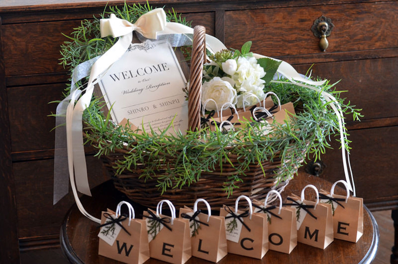 バスケットカゴにウェルカムボードを合わせたオブジェにかわいいプチギフト