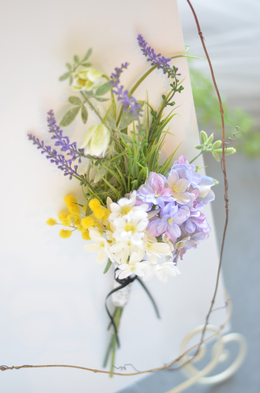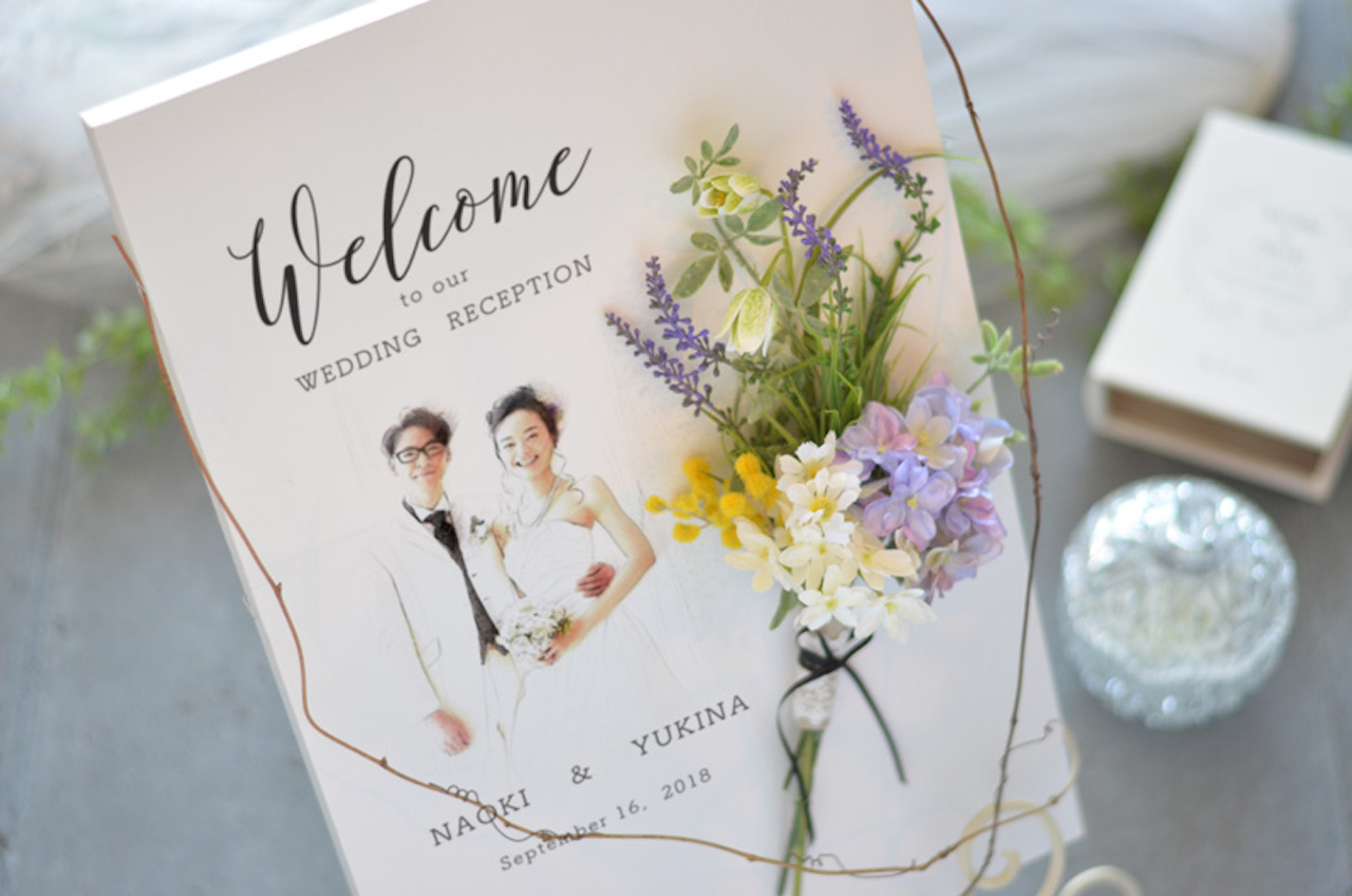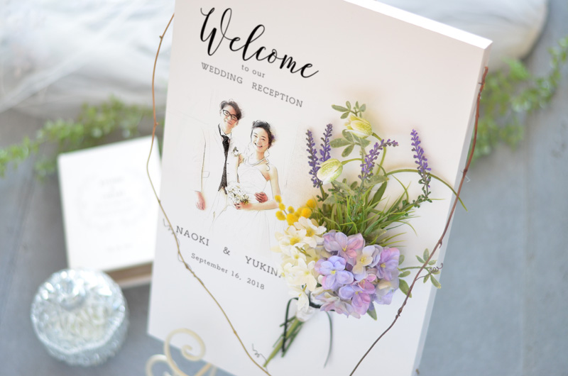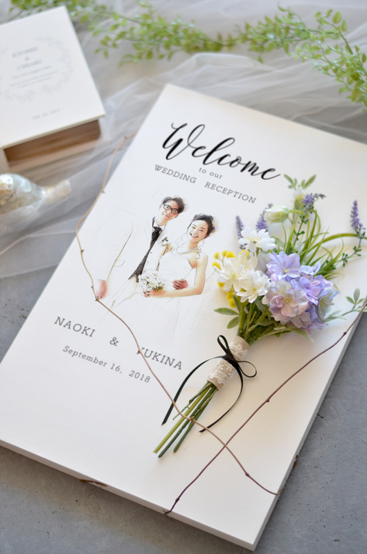 パステル画スケッチ風のイラストにフレッシュなお花と束ねたイメージの爽やかなウェルカボード