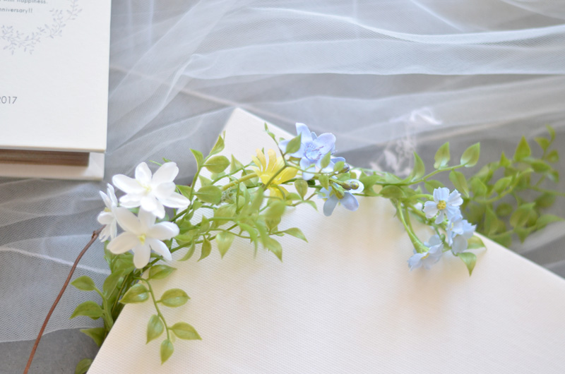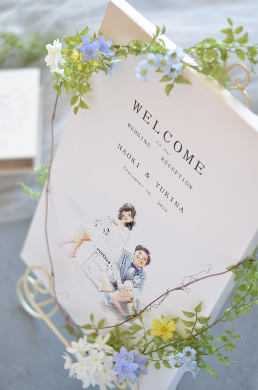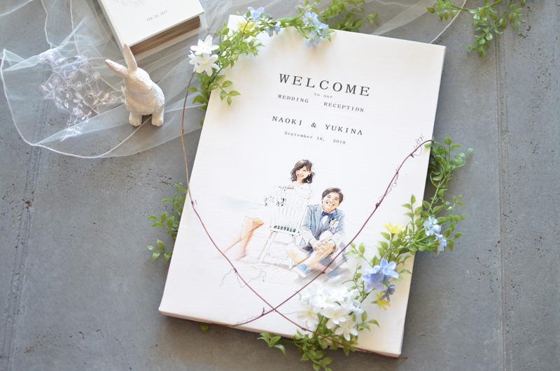 パステル画スケッチ風のイラストにグリーンと小花をさりげなくアレンジした清楚なウェルカムボード