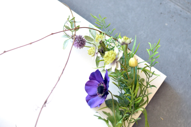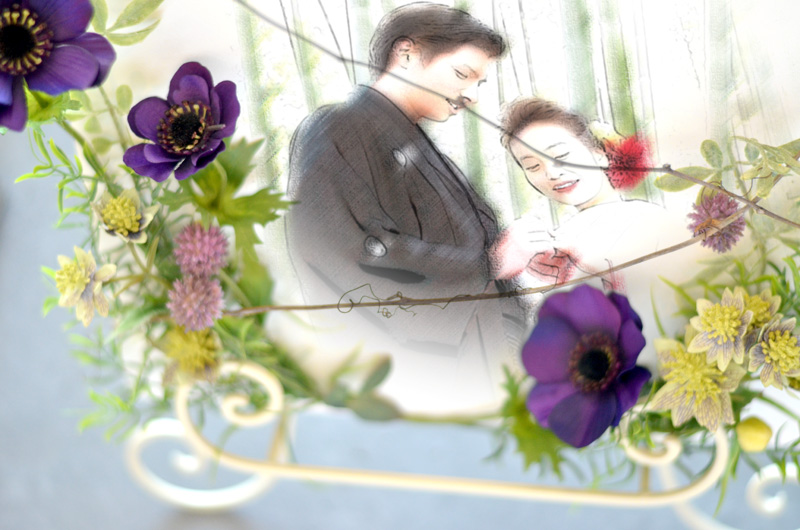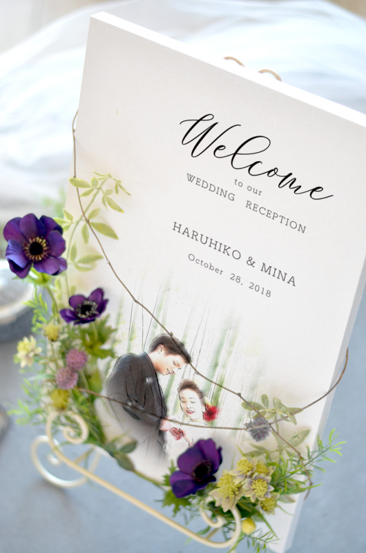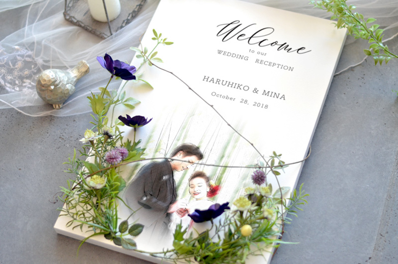 パステル画スケッチ風のイラストにフラワーアレンジ付きのウェルカムボード