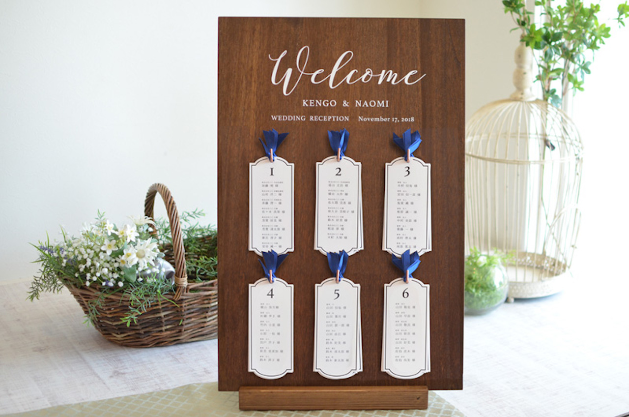 エスコートカードとなった席次表、メニューがついたウェルカムボード