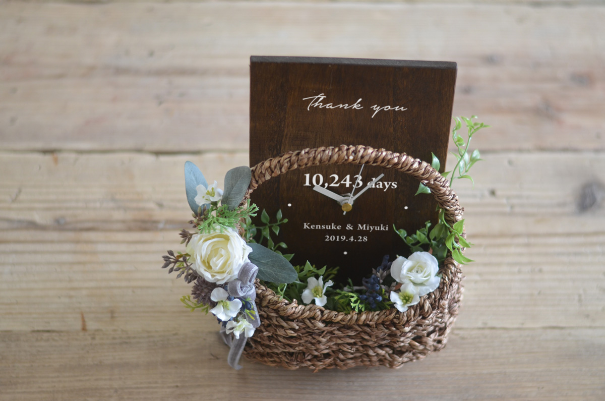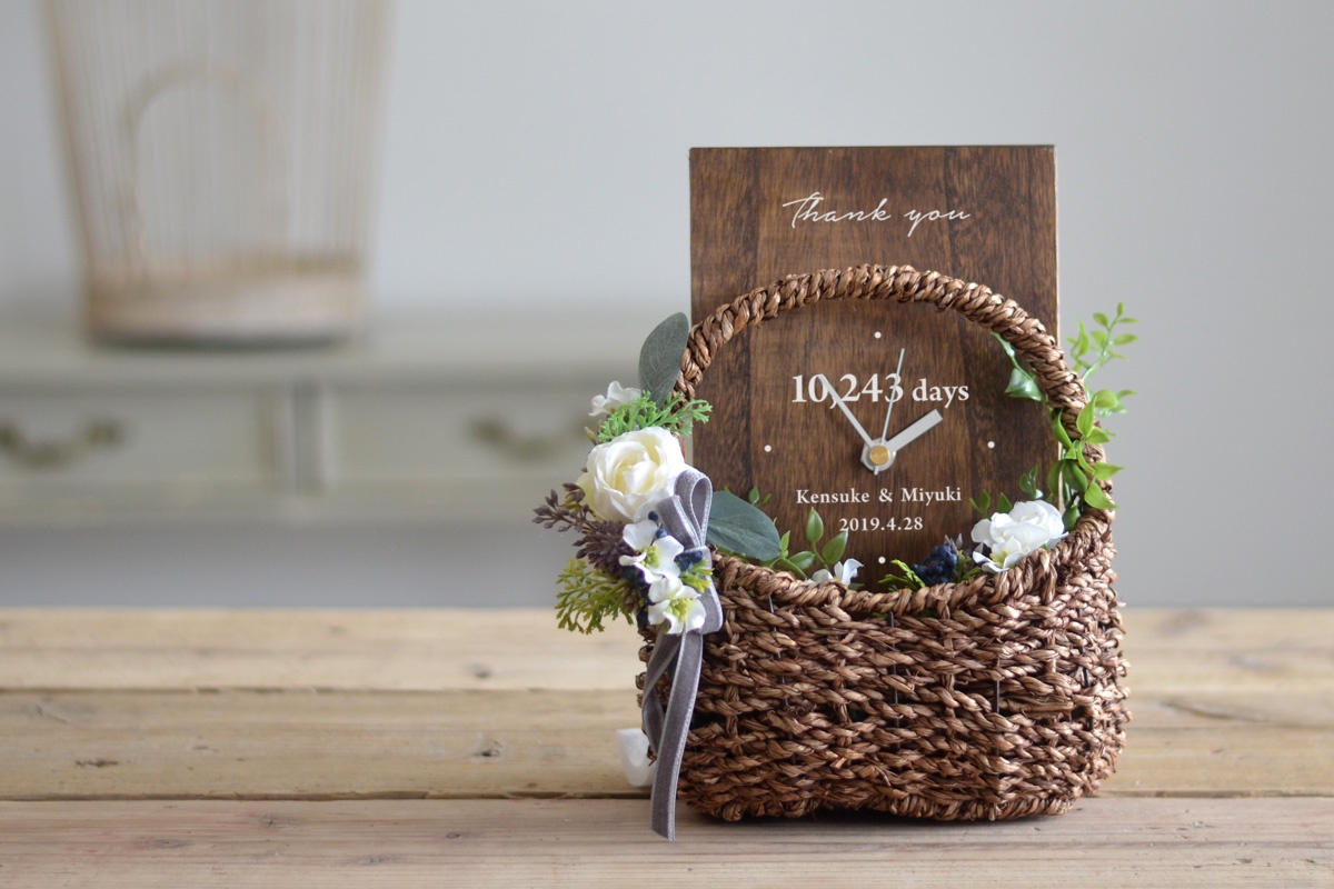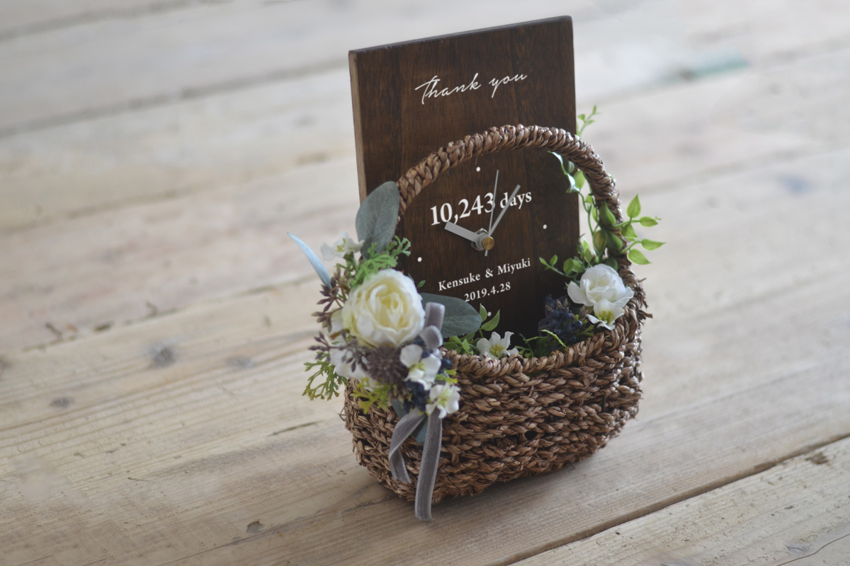 天然木の時計と華やかなバスケットが
