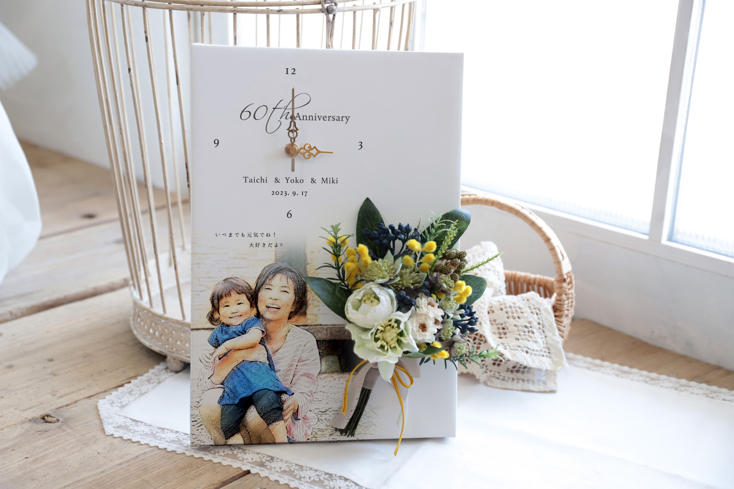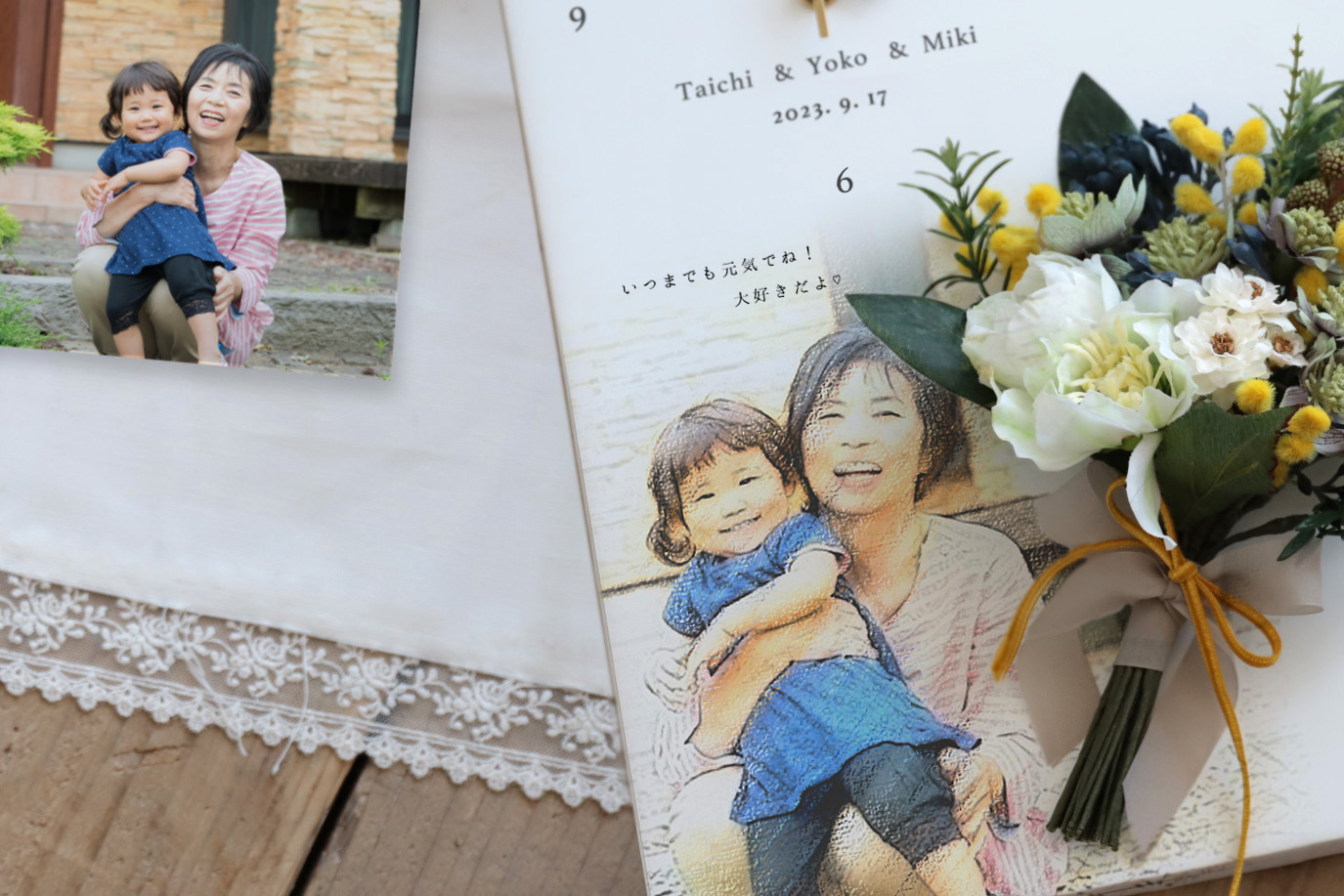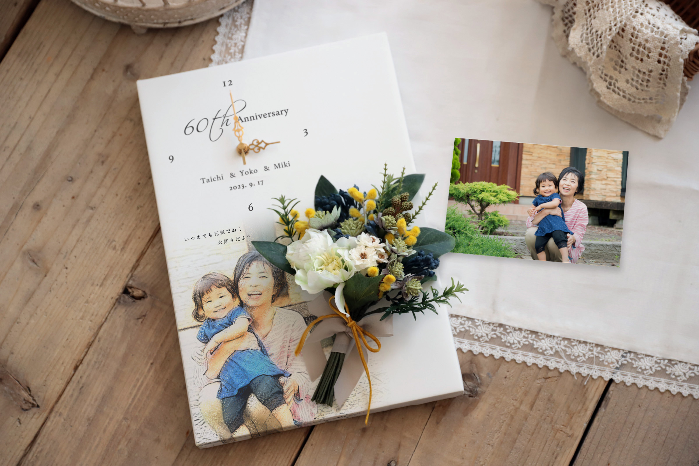 喜寿や米寿など祖父母への誕生日プレゼントにお花と似顔絵の時計